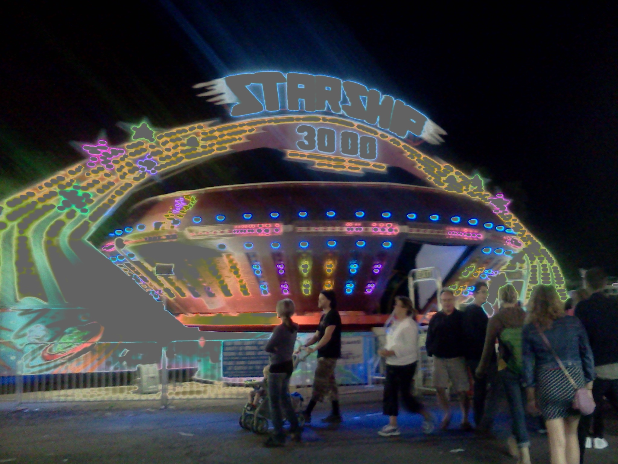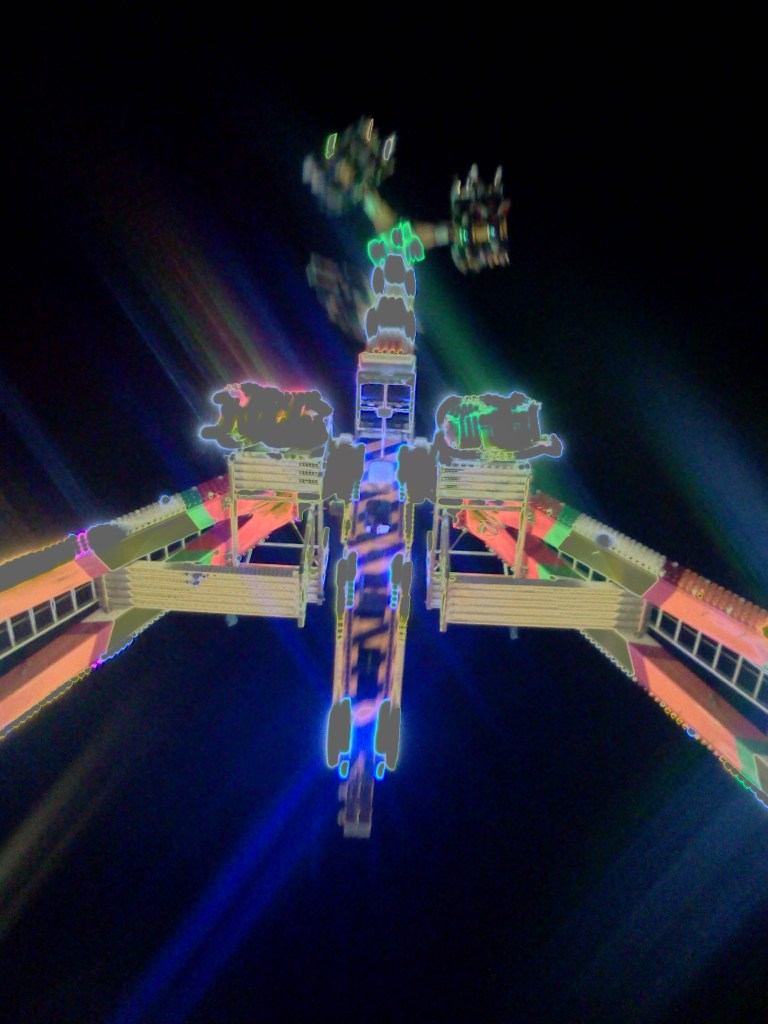 A journey through time and space we took on a ride that jubilantly announced in blinking lights “ROCK IT” (I wisely avoided the Zipper due to an experience with the ancient ride two years ago involving a nine-year-old, his mother, a lot of vomit, and a 3-gallon bucket of water that constituted the ride’s “cleaning system”).